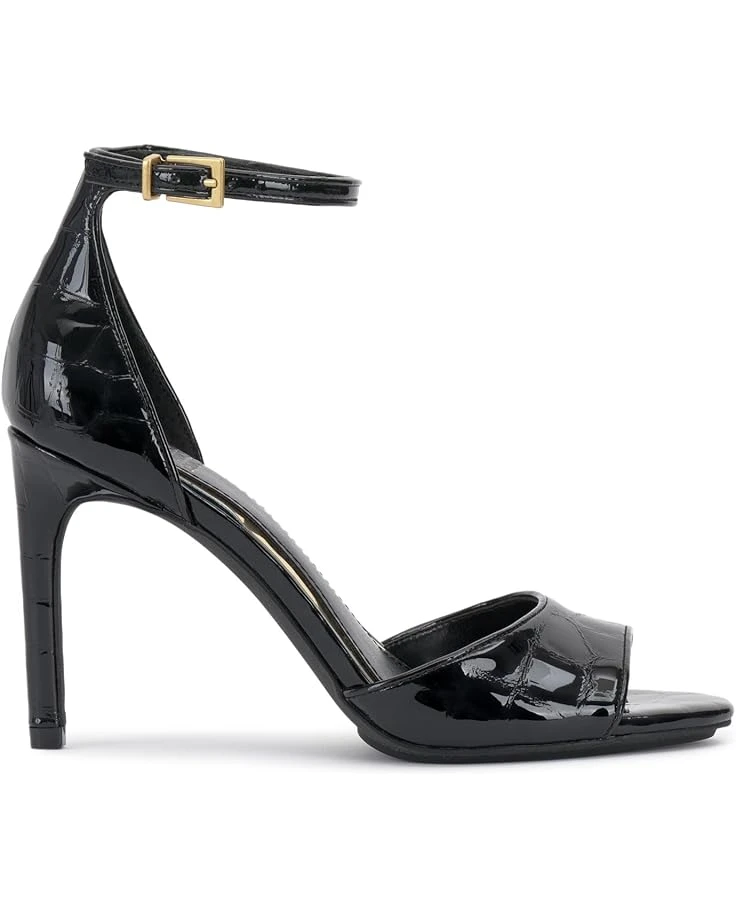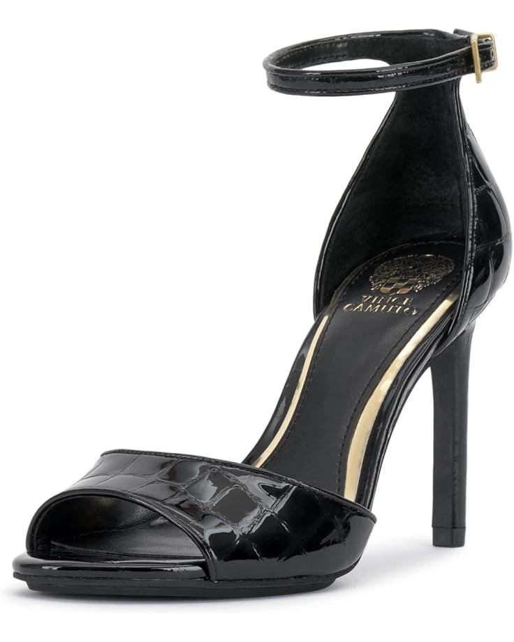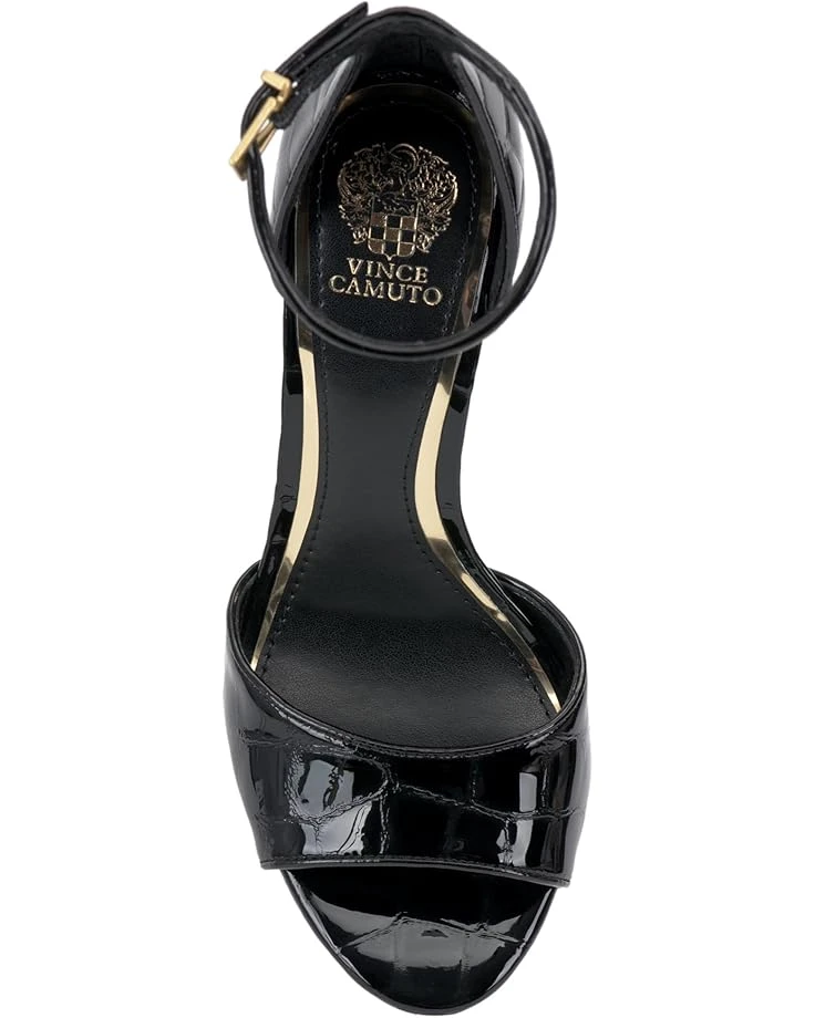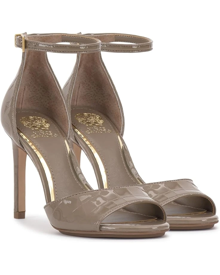 - Shine with graceful finesse wearing the Vince Camuto® Aliza Sandals. This two piece dress sandal has a rounded open toe and a covered stiletto heel. Featuring Croco print patent, metallic foil leather, or smooth soft patent upper, these heels work from coffee date to cocktails. The adjustable ankle strap with buckle closure and rubber comfort pod on the outsole of the shoe will keep you grabbing them every time you style your fit.