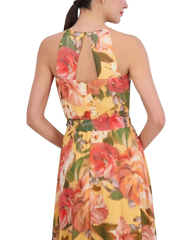 - Designed with a high-low hem with ruffle detailing on the trim, flaunt your great style by wearing the Vince Camuto® Chiffon Halter High Low Midi. The lightweight chiffon fabric of the dress offers a perfect drape. This floral dress comes with a sleeveless style and a halter neckline. From weddings to parties, this printed dress works for different occasions.