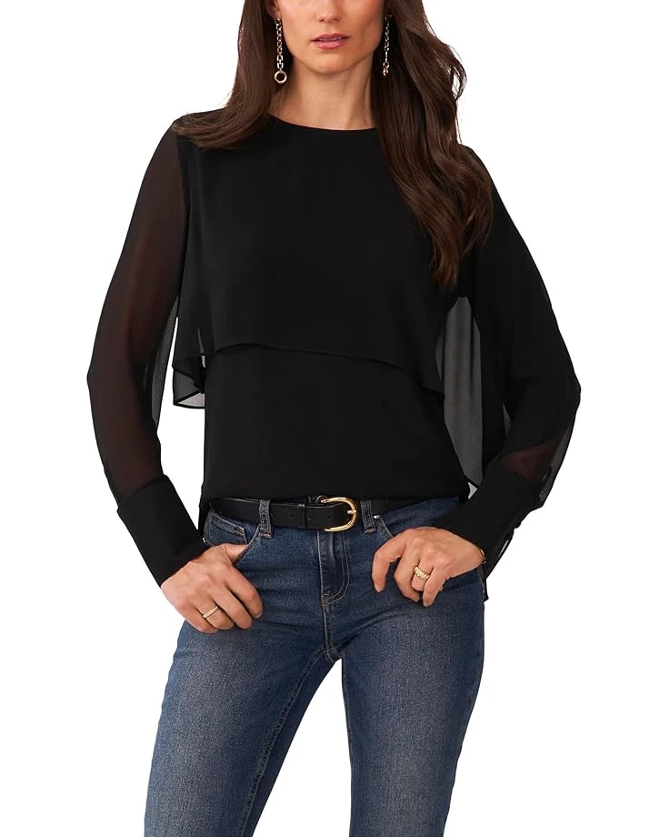 - Look fierce and fabulous wearing the regular fit Vince Camuto® Drapped Long Sleeve Blouse. Featuring long sleeves, crew neckline with back button closure, and straight hem.