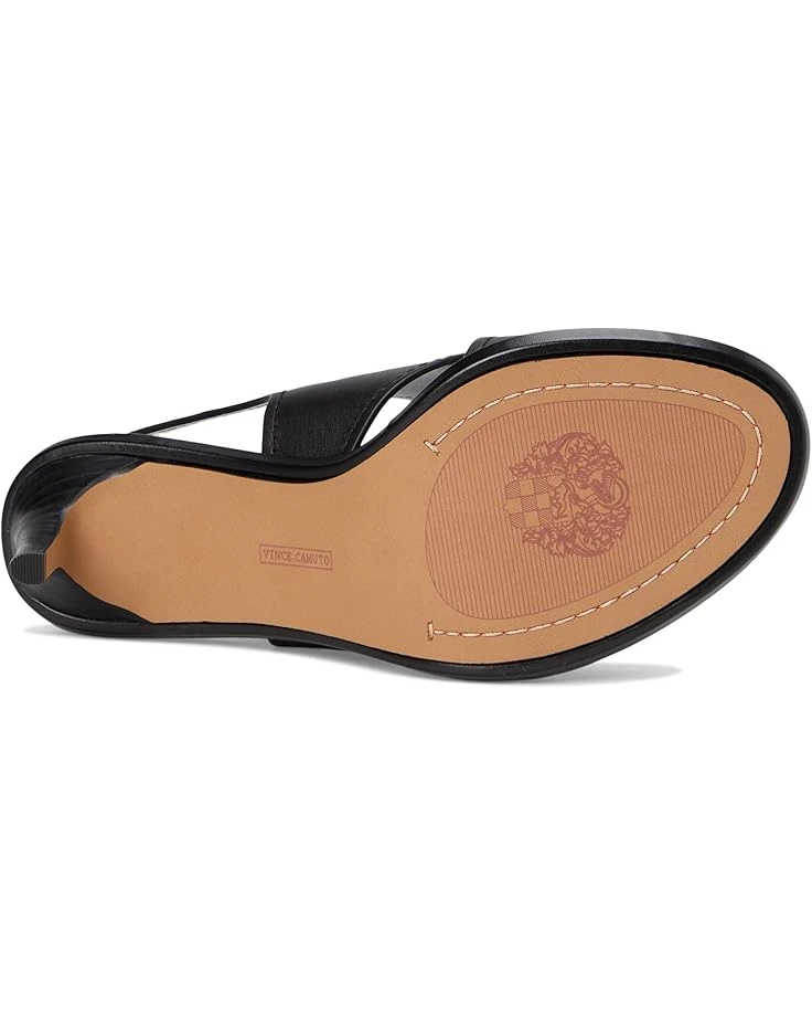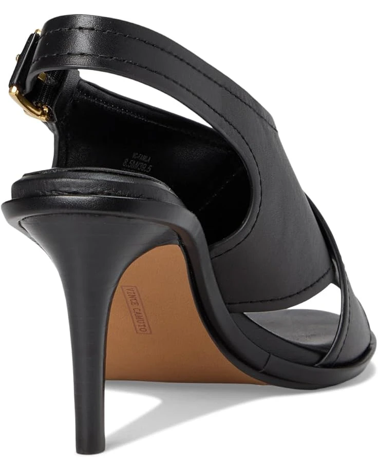 - Walk like you own the world wearing the Vince Camuto® Famla Cross-band High Heel Sandals. Crafted from leather upper, synthetic lining, and insole, this pair of sandals features round toe, crisscross X-band detailing on the upper, stiletto heel, buckle closure slingback strap, and brand detailing on the footbed.