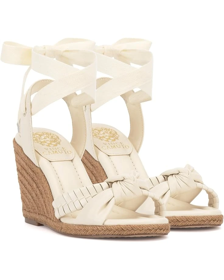 - Mark your footsteps by styling the Vince Camuto® Floriana. Elevate your style with this seasonal wedge, boasting an espadrille wrap and sliver platform. The sandal features a knotted X band strap and a sling strap with a tie ankle wrap closure for a perfect fit. The open round toe adds a touch of sophistication, while the padded synthetic insole ensures all-day comfort.