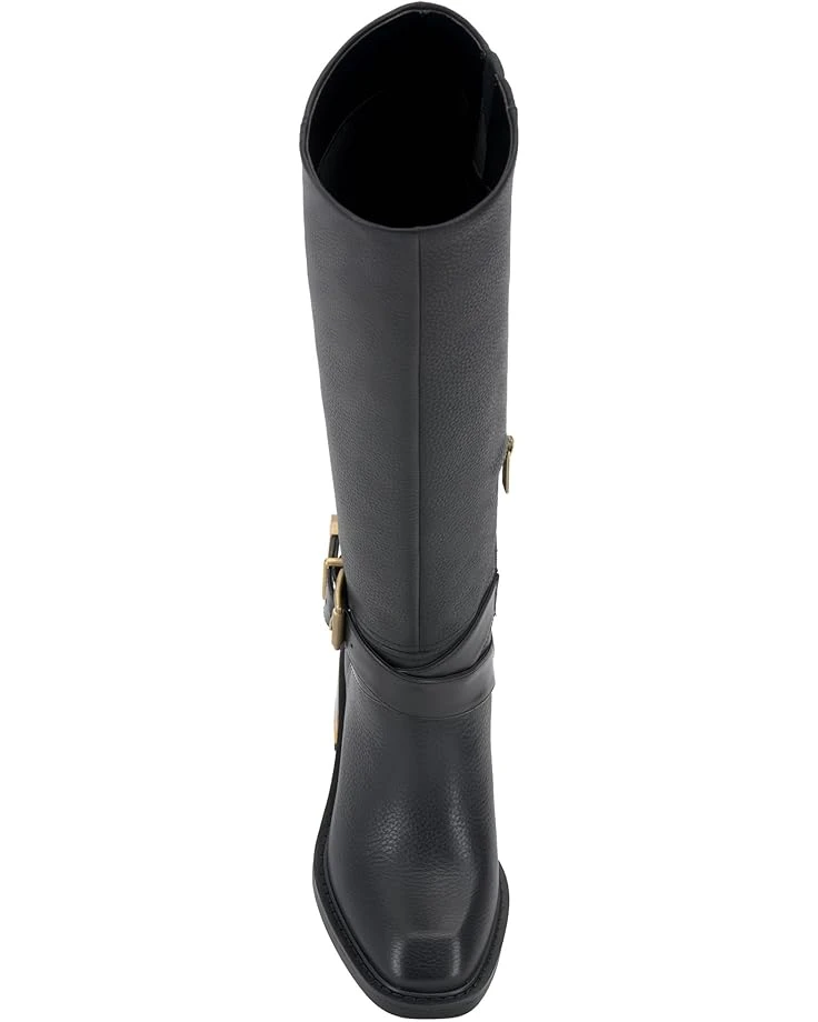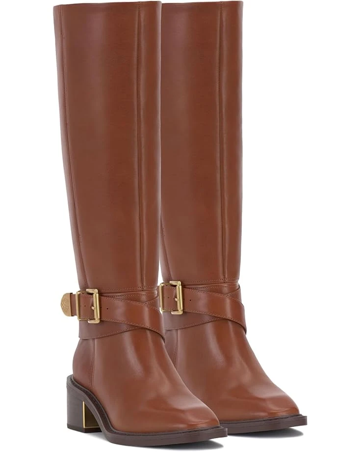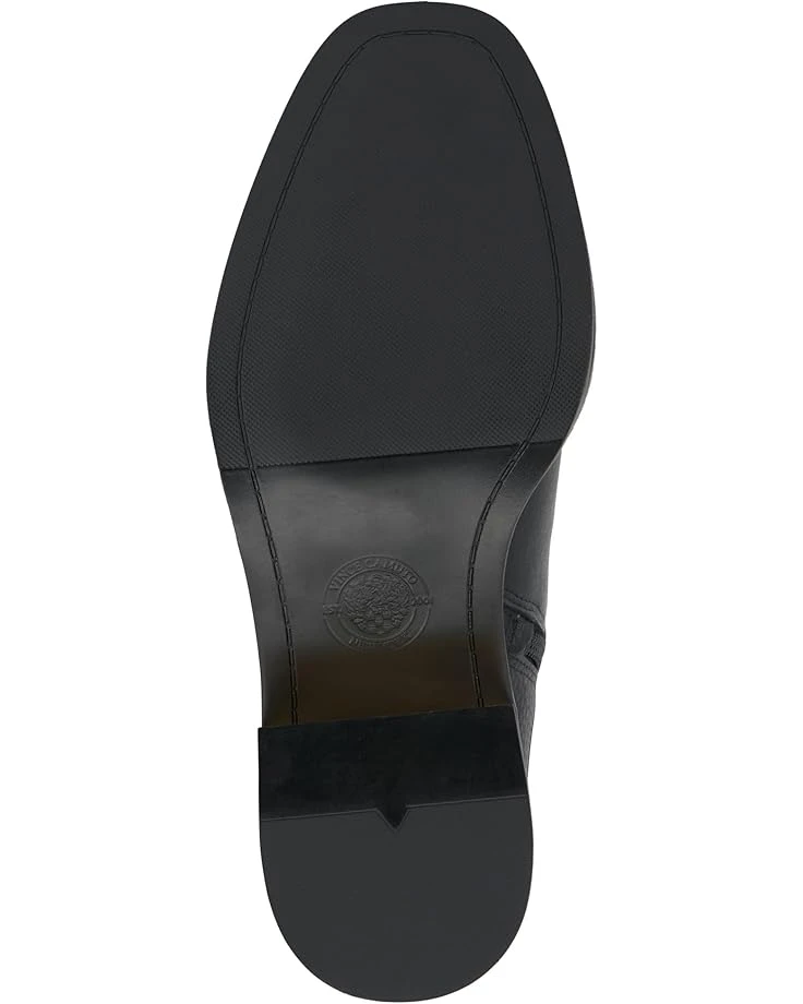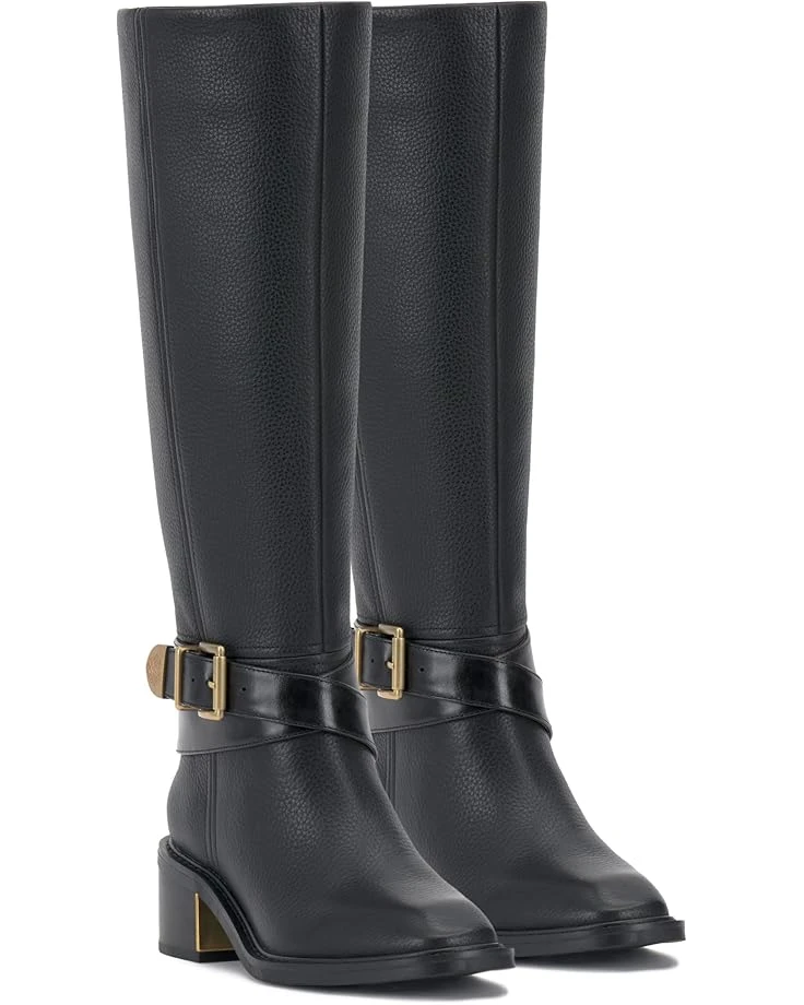 - Showcase your fondness for riding boots wearing the sleek Vince Camuto® Gini. The knee-high boot features a tapered square toe, a stacked heel with interior metal rand, and double belt at the ankle with metal buckle and logo tip. The shaft accompanies elastic gore at the topline, zippered side closure, and full rubber outsole.