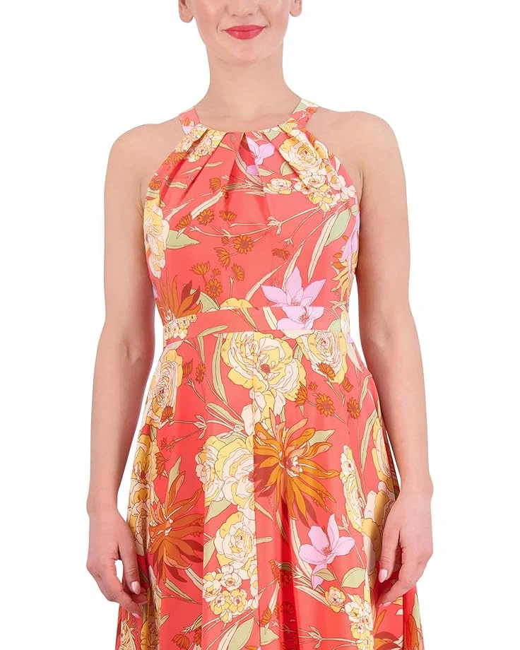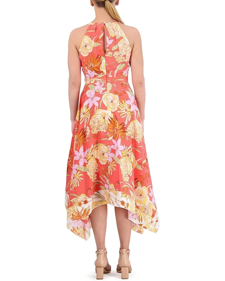 - Express your charming look donning the Vince Camuto® Halter Handker Cheif Hem Midi. The below-knee-length and allover iconic floral print dress features pleated halter neckline, floaty handkerchief hemline, and keyhole with button and zippered back closure.