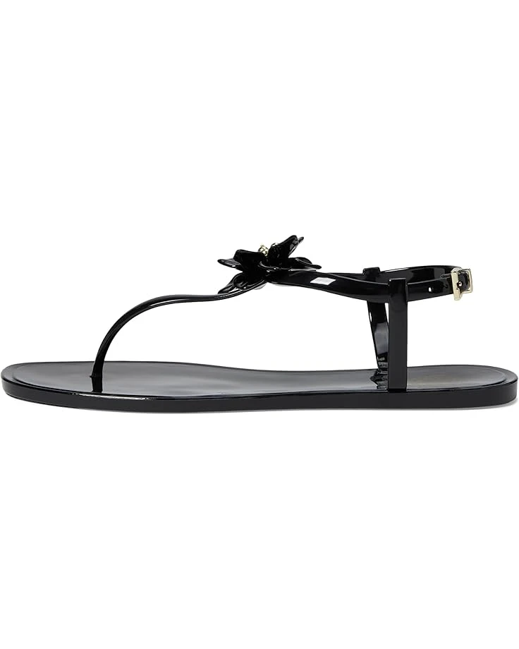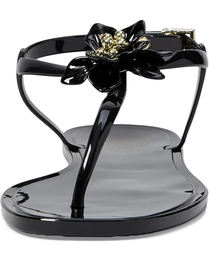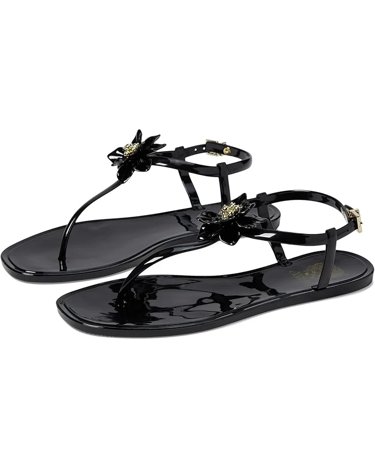 - Keep yourself beach ready wearing this Vince Camuto® Jelynn T-strap Sandals with adjustable ankle strap and buckle. The open squared toe sandal is adored with tonal flower ornament and gold metallic centers, polyvinyl chloride upper, faux leather lining, and plastic insole.