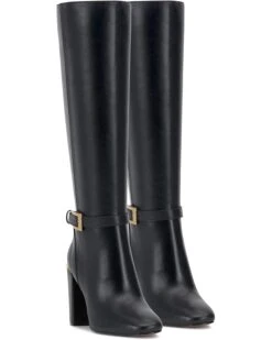 - This sophisticated Vince Camuto® Joanel is a must-have addition to your contemporary wardrobe. With a soft square toe and high-block heel, this knee-high riding boot has a side zipper entry with elastic gore for improved fit and comfort. The detailing includes a metal rand detail on the upper heel and an ankle belt with elongated buckle closure.