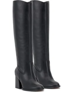 - The knee-high Vince Camuto® Leila tall shaft boot has a modern vintage vibe. With soft round toe and a stacked block heel, this sleek boot has zippered side closure and elastic goring on the shaft for improved fit. The footwear is fabric lined and finished on the exterior with a leather-covered welt and rubber outsole.