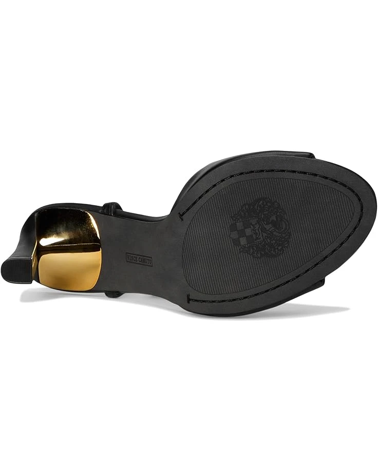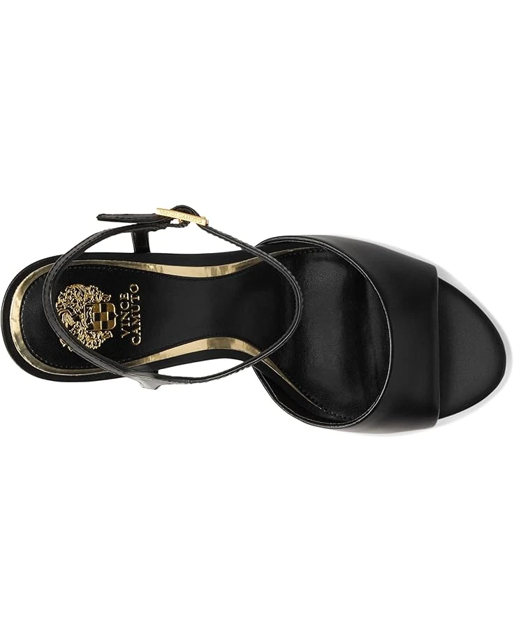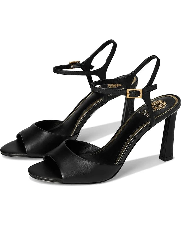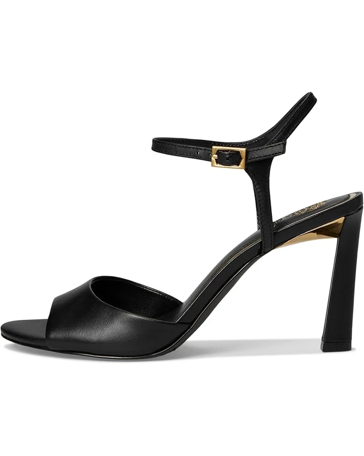 - The Vince Camuto® Lilah Ankle Strap High Heel Sandal offers both style and comfort. Featuring a luxe leather upper, polyester lining, and a padded insole, it offers all-day ease. The block heel and open-toe design exude modern charm, while the delicate adjustable ankle strap ensures a secure, custom fit. Enhanced by sleek gold metal detailing on the sole, this two-piece sandal is your go-to for polished style and reliable comfort, whether you’re dazzling at a soirée or commanding attention at brunch.