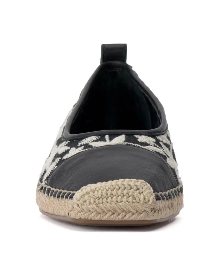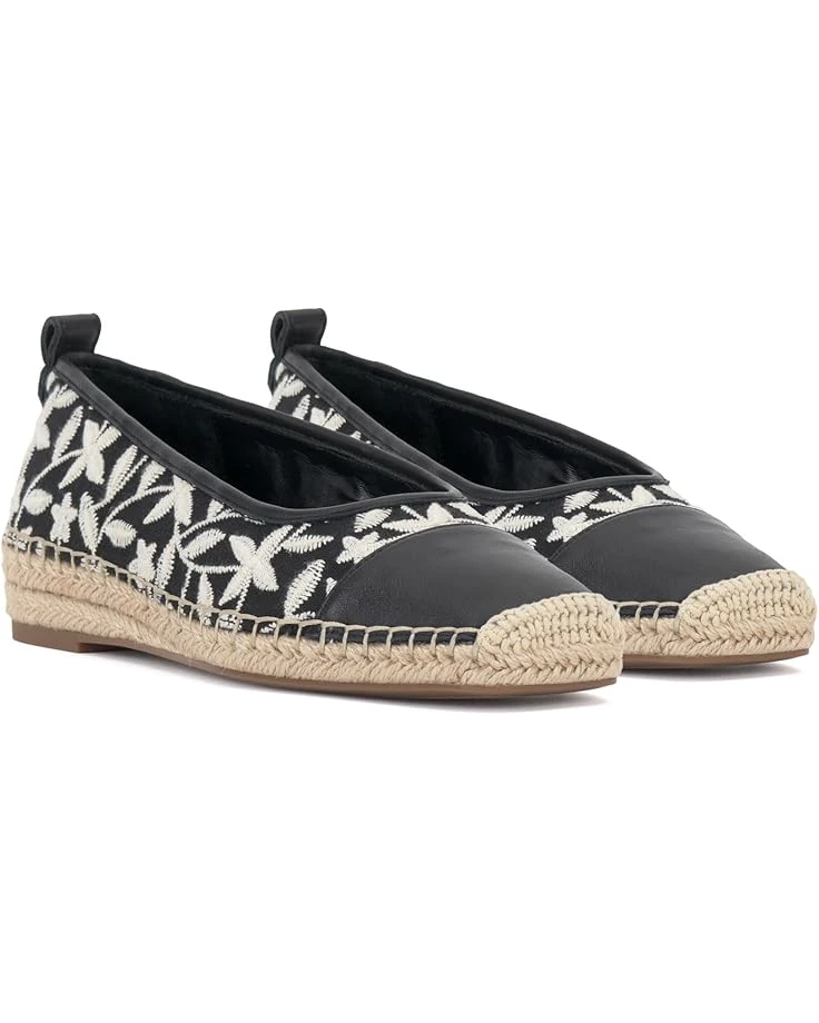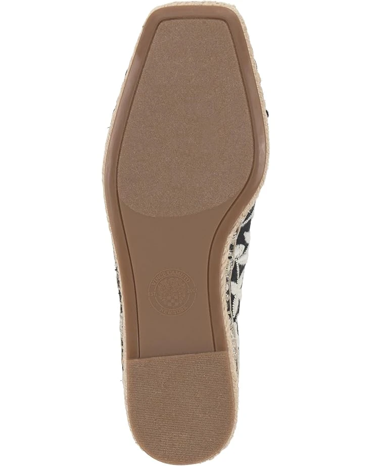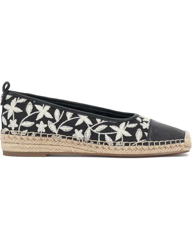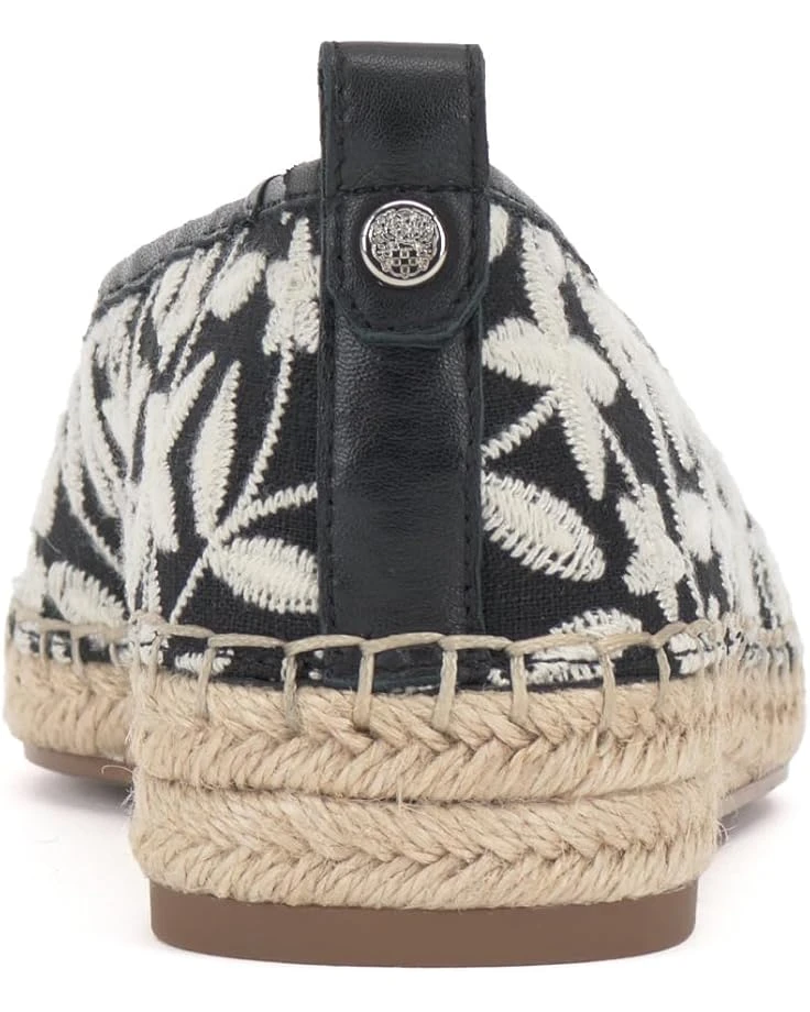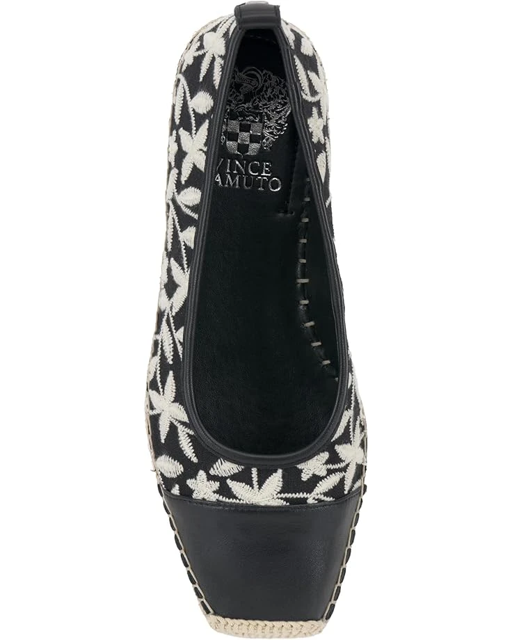 - Indulge in the perfect blend of casual charm and refined style with the Vince Camuto® Miheli flats. These flats boast a traditional espadrille-wrapped wedge heel, beautifully contrasting with a whipstitched details. The fabric upper is meticulously adorned with intricate floral embroidery, harmoniously complemented by a solid leather, square cap toe.