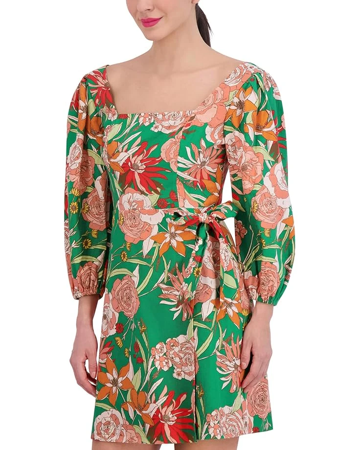 - Get ready to bloom with style this festive season wearing the Vince Camuto® Printed Linen A-Line Dress! Printed with bright and beautiful florals to match your vibrant personality, the dress looks interesting with its square neckline, balloon three-quarter sleeves with elasticized cuffs, a bow tie accent on the waist, and a smocked back panel with a zippered closure.