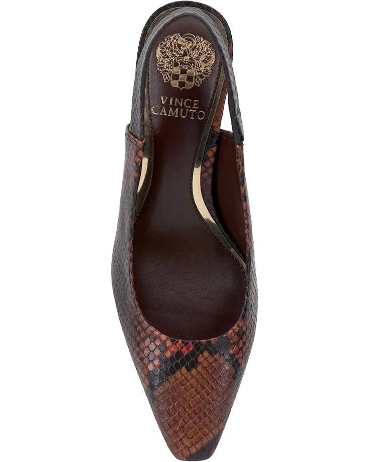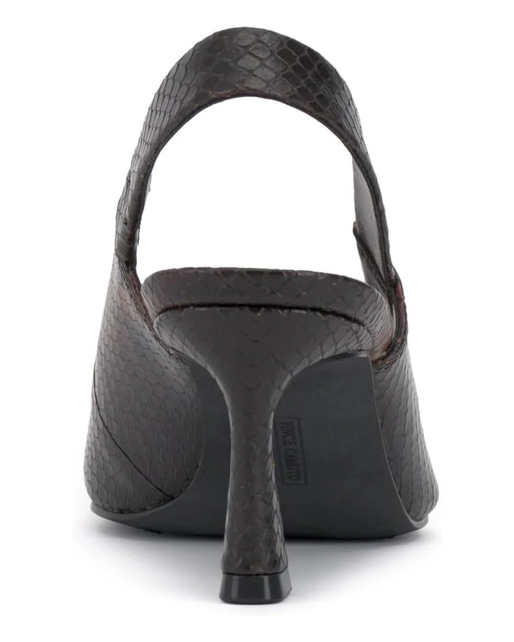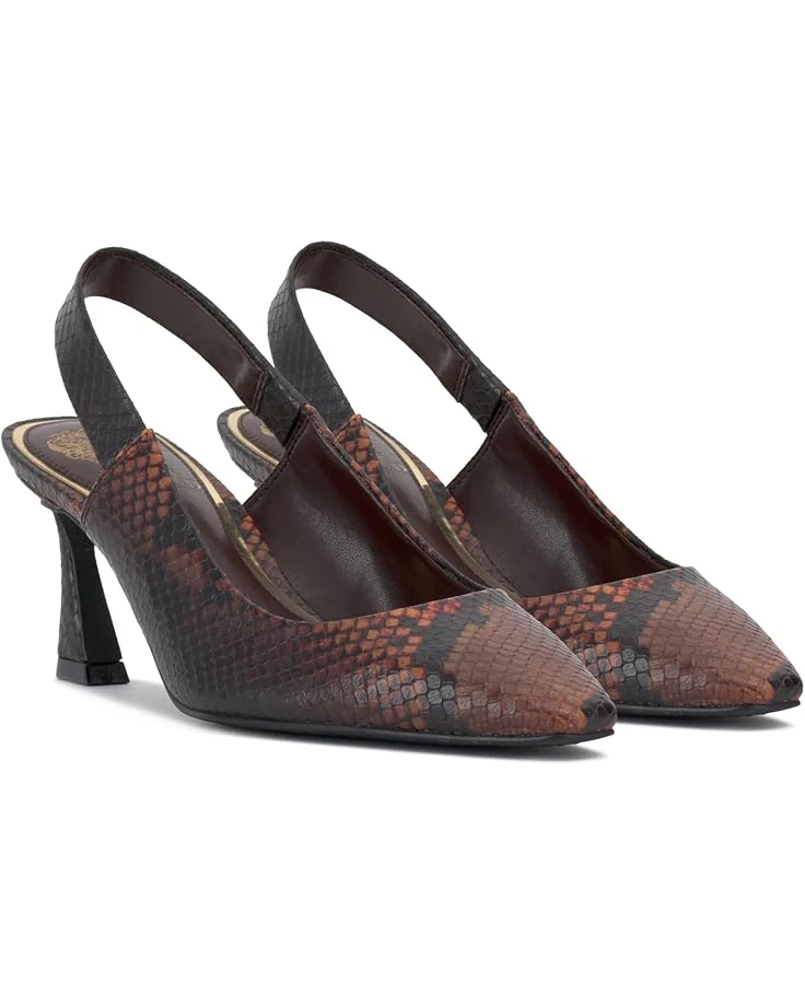 - Clean and classic describe this Vince Camuto® Samila Slingback Pump with elastic gored strap and flare heel. Constructed with a snip toe and leather covered heel, this slingback provides adequate coverage and padding to keep your feet happy and simple details like metallic trim on the sock to keep the eyes happy.