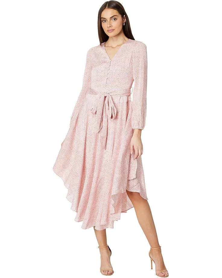 - Featuring an asymmetrical flowy skirt, the Vince Camuto® V Neck Tie Waist Maxi Dress- L showcases an art of contrast with a striking print pattern designed allover. It has a V-neckline with soft buttons on the front, long puffy sleeves, and self-tie belt at the waist offering a structured fit.